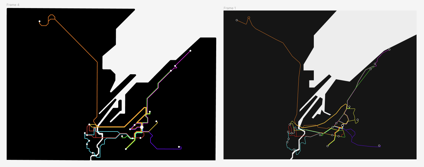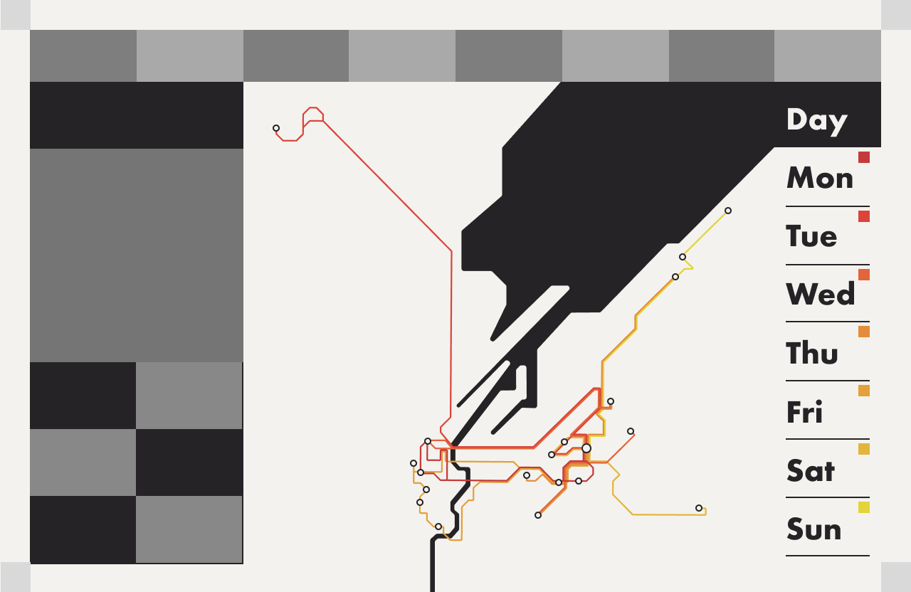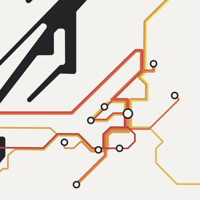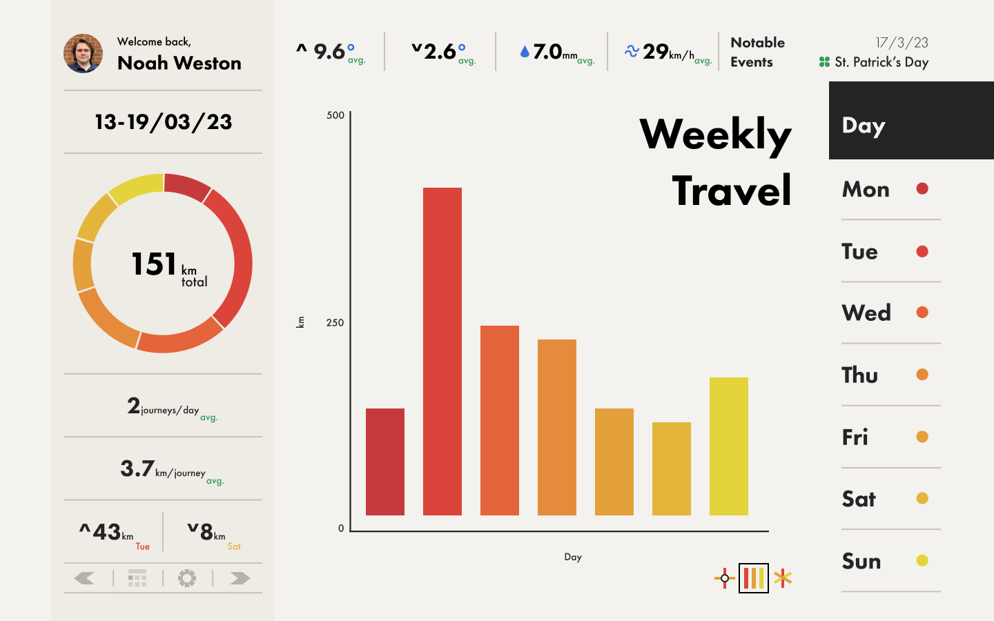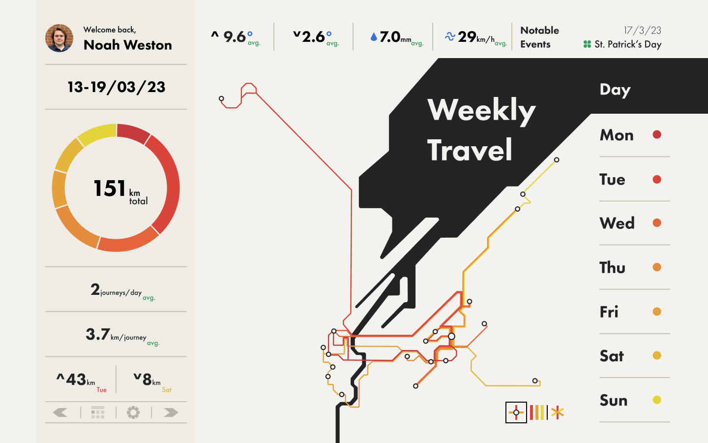 To begin development, I designed a tube map-style diagram of my weekly travel as I knew this was what I wanted to be the centrepiece of my dashboard. I had tried more accurately mapping out the routes, however it felt too messy and what I wanted to show was each stop rather than exactly what route was taken, so a geographically inaccurate map would work better.