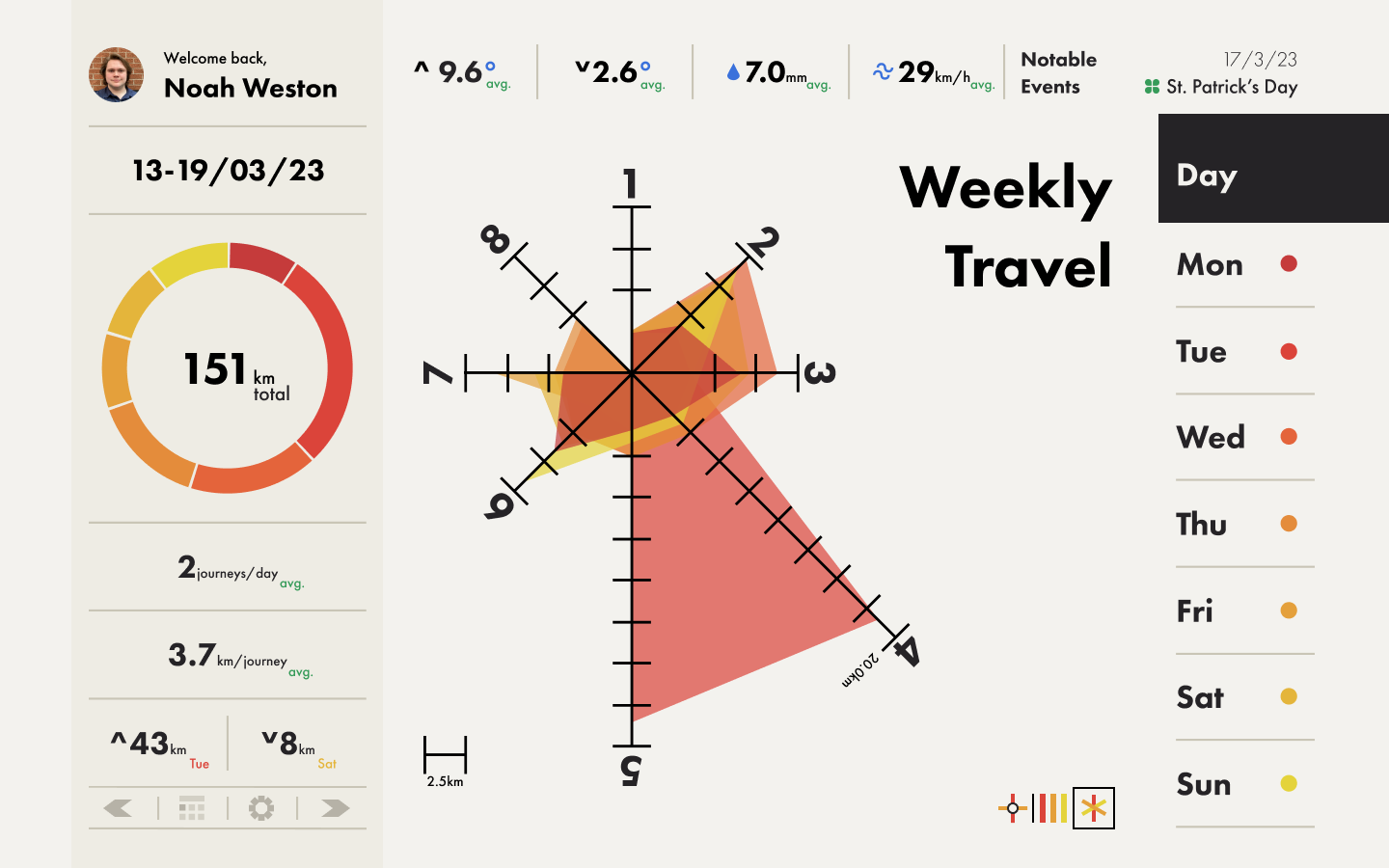 The radar plot was an interesting visualisation as it showed how far I went but also showed the distribution of the distances. Due to the multiple ways this showed data, I created a value from the figures which I called "travel density", as a way of comparing both how far and in how many stops I went each day.