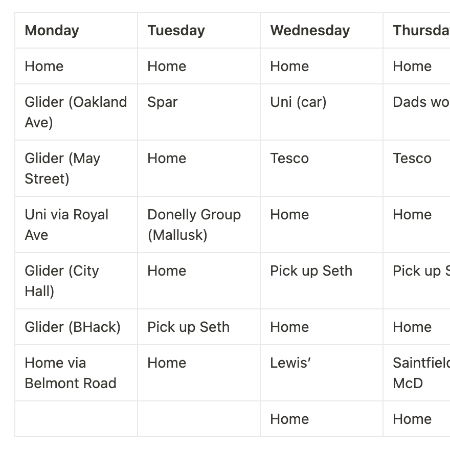 For this project, I chose to look at my movements over a week. While the project allowed for different data sets to be used, I thought an interesting approach would be to use one data set and explore how different visualisations could reveal different information about the data. I began by recording everywhere I went during a week and the distances between locations.